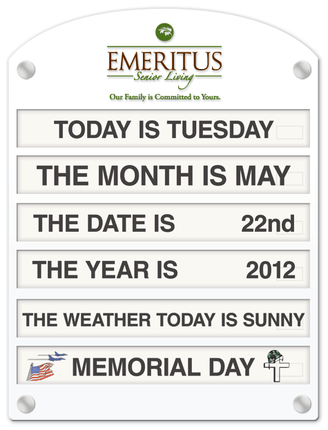 - Our Reality Orientation Board helps remind people of daily essentials: the day of the week, the month, the date, the year, the weather and even special holidays.
